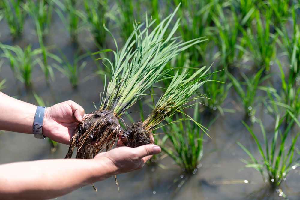 2025年6月18日,在黑龍江省雙鴨山市寶清縣一片水稻田旁,中國水稻研究所北方水稻研究中心科研人員查看應用寒地水稻秸稈全量原位還田緩釋多效綜合技術的水稻(左)與普通水稻的長勢差別。該技術能夠有效減少化肥用量、提升土壤有機質含量,節(jié)約成本、提產增效。