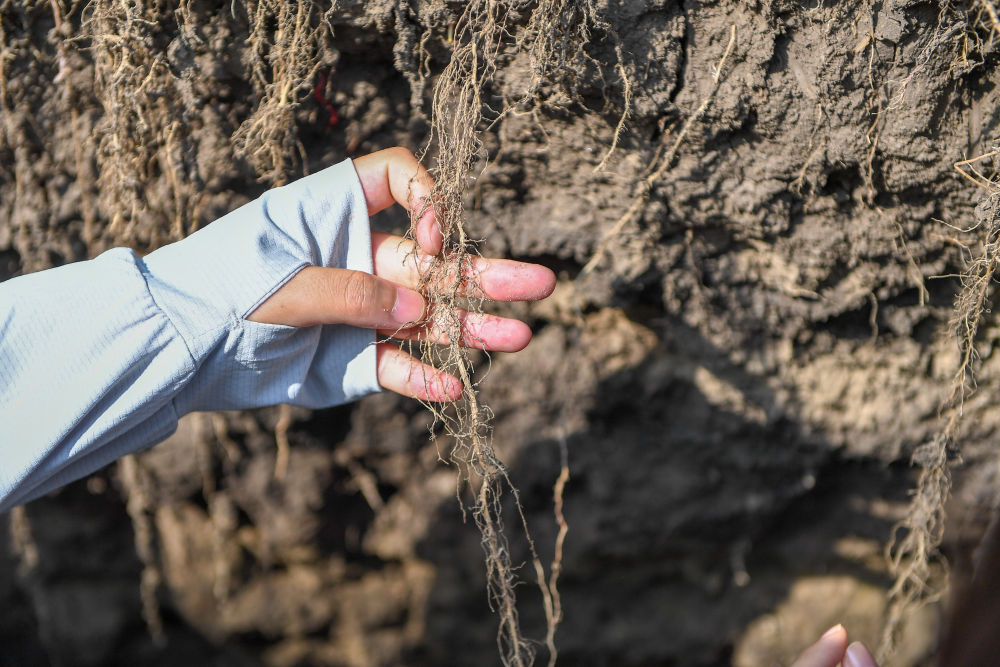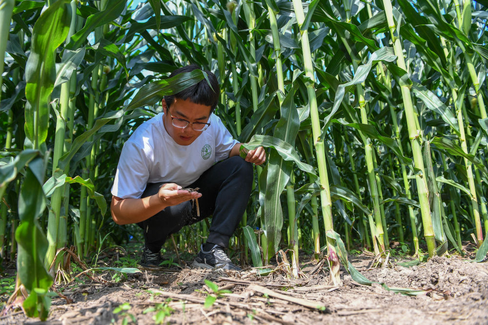 2023年7月31日,在位于吉林省四平市梨樹縣的中國農業(yè)大學“科技小院”保護性耕作試驗田,一名學生查看玉米根部在黑土中的生長情況。