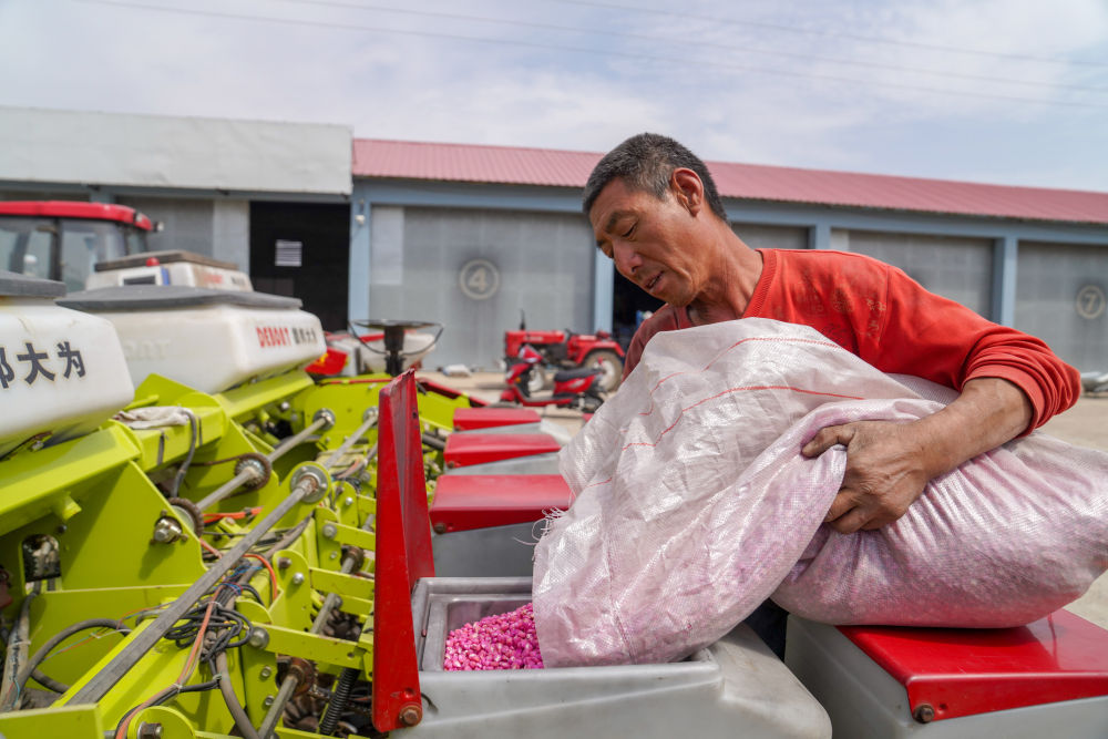 2020年5月7日,在吉林省四平市梨樹縣康達農機農民專業(yè)合作社,農民向免耕播種機里投放玉米種子。