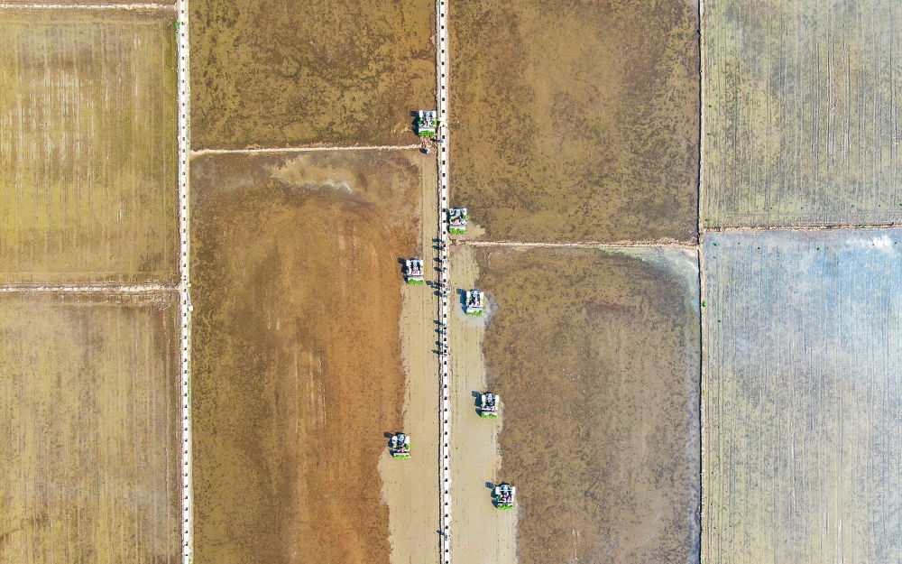 2022年5月13日,在遼寧省鐵嶺市鐵嶺縣新臺子鎮(zhèn),農民駕駛農機在稻田里插秧(無人機照片)。