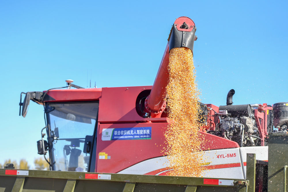 2023年10月19日,在中國科學院“黑土糧倉”科技會戰(zhàn)長春示范區(qū)公主嶺示范基地,無人駕駛農機將收獲的玉米裝車。
