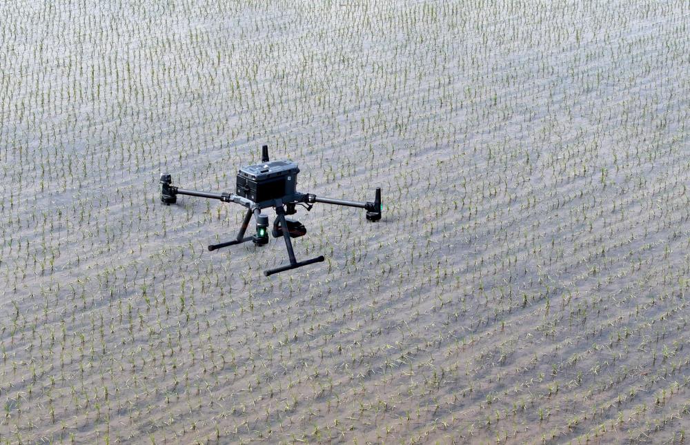 2025年5月21日,在黑龍江省北大荒農業(yè)股份八五六分公司第六管理區(qū)農業(yè)現代化示范區(qū),搭載多光譜、可見光攝像頭的無人機對水稻插秧后田塊進行土壤墑情監(jiān)測(無人機照片)。