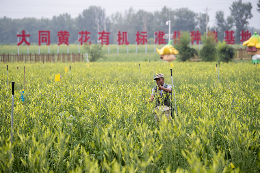 村民在位于云州區(qū)唐家堡村的大同黃花有機標(biāo)準(zhǔn)化種植基地內(nèi)采摘黃花(2022年7月27日攝)。新華社記者 楊晨光 攝