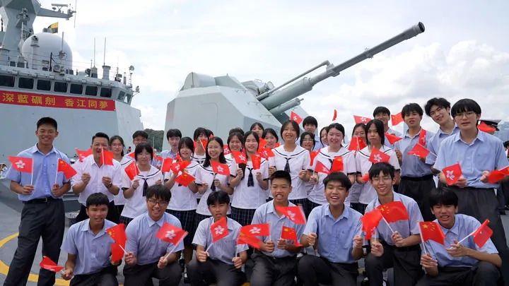 2025年7月3日,中國海軍山東艦航母編隊抵達(dá)香港。香港中學(xué)生登上海軍運城艦參觀、留影。