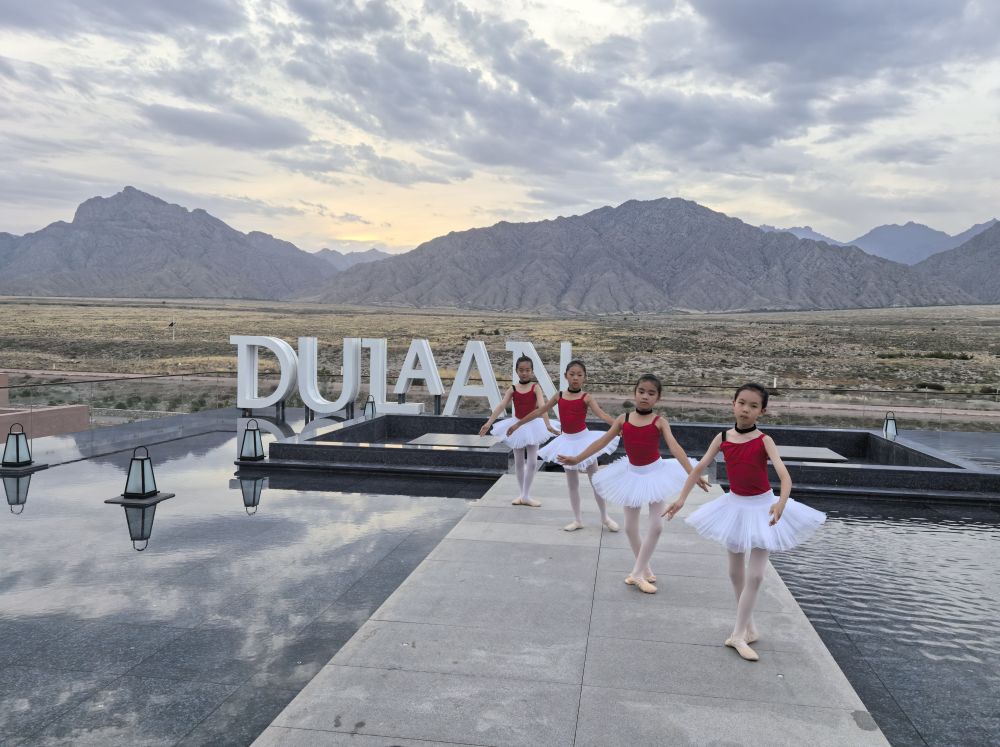 寧夏銀川市圖蘭朵葡萄酒小鎮(zhèn)安漠酒店觀景臺(tái),游客在拍照打卡(2025年6月6日攝)。新華社記者 馬麗娟 攝