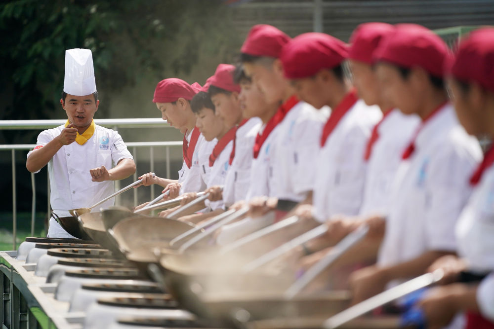 2023年6月25日,在位于西安市藍田縣的藍田廚師學校,教師指導學生們練習翻勺。藍田縣是著名的“廚師之鄉(xiāng)”。通過成立廚師學校,培養(yǎng)具有較高文化素養(yǎng)、藝術(shù)素養(yǎng)的一專多能的新一代廚師,藍田縣讓具有地方特色的職業(yè)教育拓展就業(yè)渠道,助力鄉(xiāng)村振興。