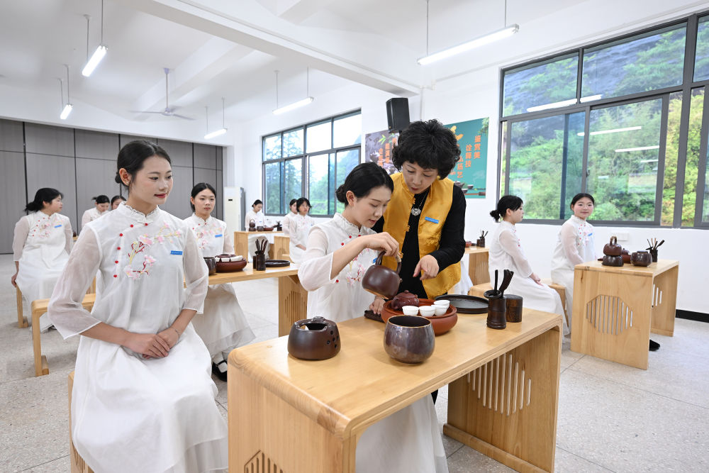 2025年5月8日,福建省武夷山旅游職業(yè)中專學校的茶藝老師在教授茶藝。近年來,武夷山市依托當?shù)夭璁a(chǎn)業(yè)優(yōu)勢,持續(xù)推進茶文化、茶技能教育走進校園,在當?shù)芈殬I(yè)學校重點開設(shè)了茶藝、茶葉加工、茶營銷等專業(yè),為當?shù)夭璁a(chǎn)業(yè)發(fā)展、茶文化傳播培養(yǎng)職業(yè)技能人才。