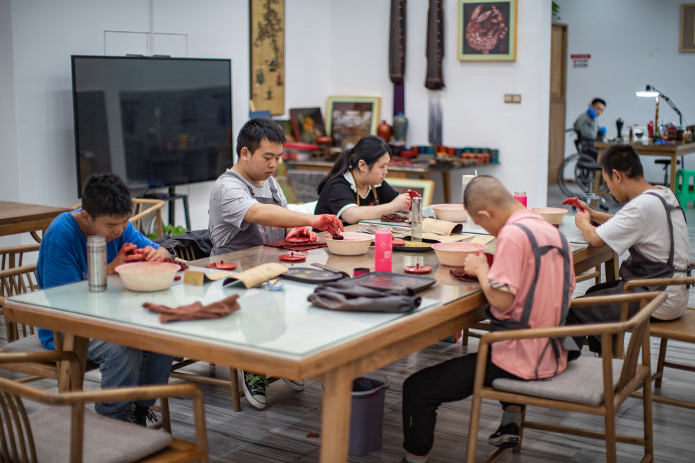 2023年9月18日,在重慶市城口縣的“忘我”大漆藝術(shù)空間,殘障員工打磨漆器產(chǎn)品?!巴摇贝笃崴囆g(shù)空間集殘疾人漆藝培訓、輔助性就業(yè)、職業(yè)康復、日間照料等功能于一體,利用當?shù)氐拇竽酒豳Y源,組織殘疾人創(chuàng)作漆器產(chǎn)品。