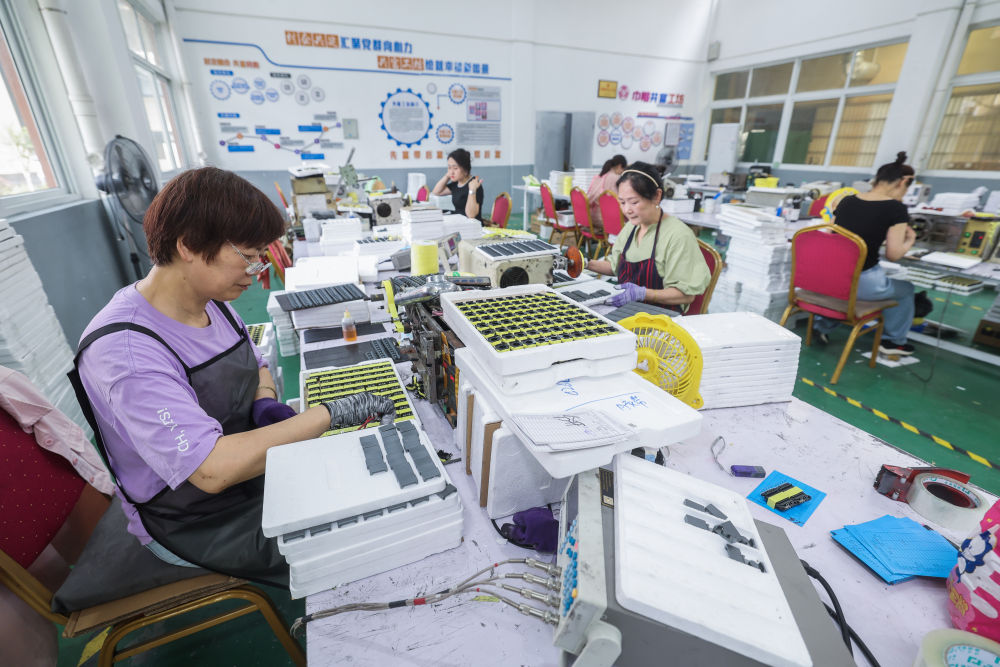 2025年6月19日,村民在浙江省海寧市鹽官鎮(zhèn)桃園村紅“芯”共富工坊內(nèi)工作。該共富工坊針對有靈活就業(yè)需求的低收入村民,采用“靈活就業(yè)+固定用工”彈性用工方式,促進群眾就業(yè)增收。