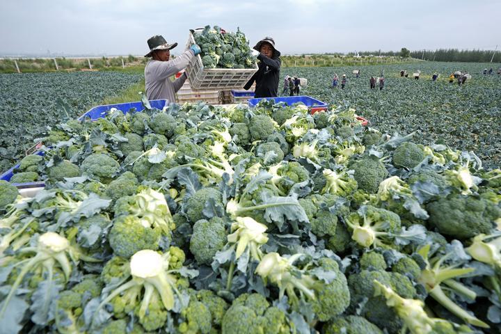 2025年7月18日,工作人員在寧夏固原市原州區(qū)彭堡鎮(zhèn)萬(wàn)畝冷涼蔬菜基地運(yùn)輸西蘭花。固原依托高海拔、氣候冷涼等“冷資源”優(yōu)勢(shì),大力發(fā)展冷涼蔬菜產(chǎn)業(yè),著力打造“六盤山冷涼蔬菜”區(qū)域公用品牌。目前已建成冷涼蔬菜規(guī)?;N植基地130余個(gè),種植面積穩(wěn)定在50萬(wàn)畝,年產(chǎn)鮮菜200萬(wàn)噸以上?!傲P山冷涼蔬菜”這張打造的“綠色名片”,已成為當(dāng)?shù)剜l(xiāng)村振興發(fā)展之路上的“熱產(chǎn)業(yè)”