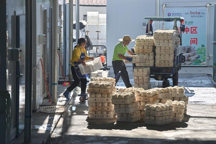 2024年10月31日,村民在廣西百色市德??h那造村食用菌生產(chǎn)基地搬運(yùn)采摘的蘑菇。那造村通過(guò)做優(yōu)特色產(chǎn)業(yè)、豐富村民生活、完善基礎(chǔ)設(shè)施等多項(xiàng)具體舉措,推動(dòng)各項(xiàng)事業(yè)快速發(fā)展。