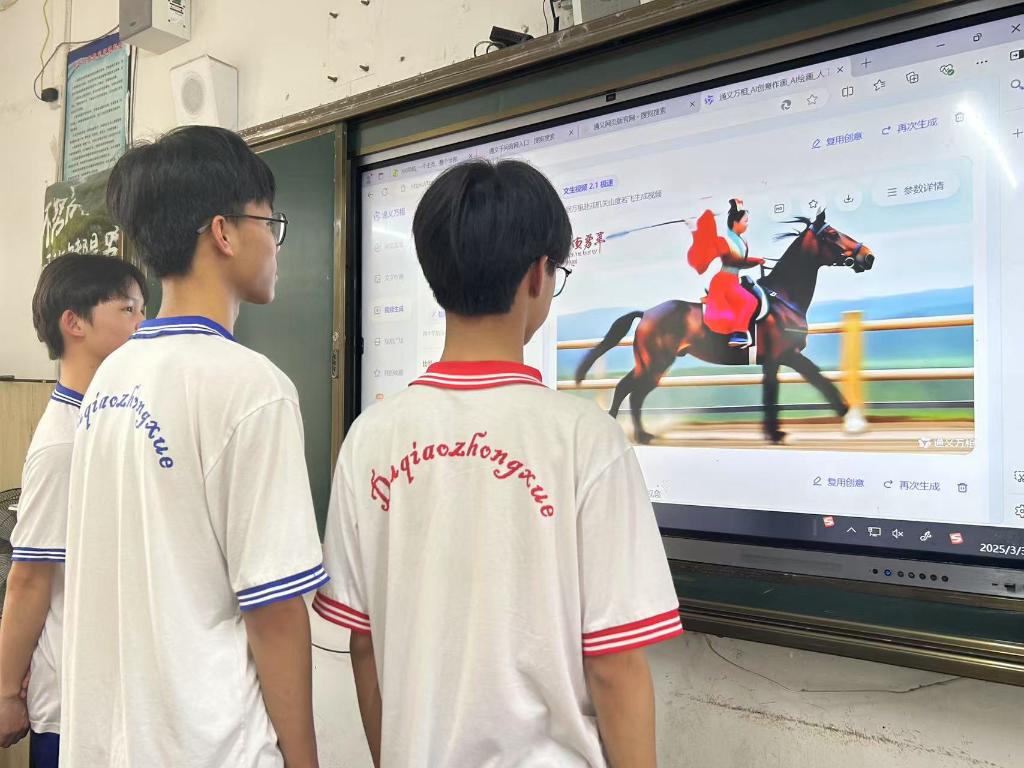 3月3日,廣西容縣容州鎮(zhèn)都嶠中學學生觀看老師使用人工智能大模型生成的海報,感受語文課堂的互動創(chuàng)新。(陳春仲 攝)