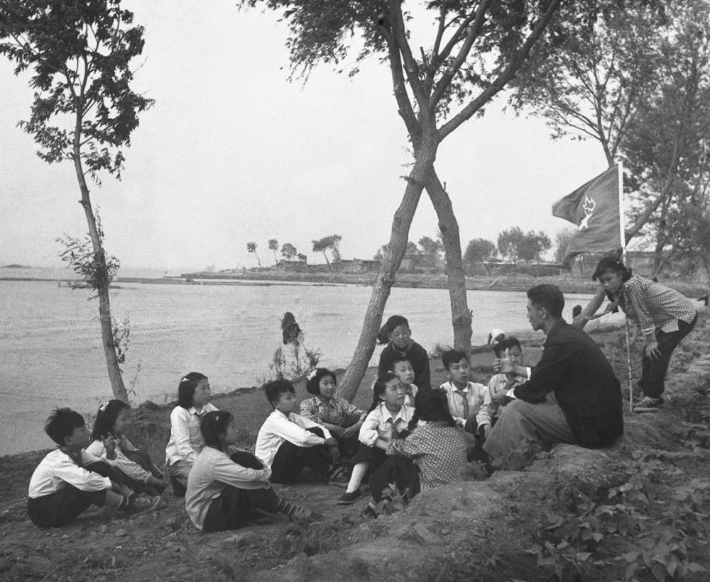 1955年,在河北白洋淀,新安小學(xué)的少先隊員們聽曾擔(dān)任過抗戰(zhàn)時期兒童團團長的陳殿元講抗戰(zhàn)故事。