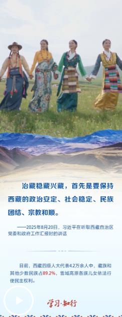 2025年8月20日,習(xí)近平總書記率中央代表團(tuán)乘專機(jī)抵達(dá)拉薩,出席西藏自治區(qū)成立60周年慶?;顒印T诼犎∥鞑刈灾螀^(qū)黨委和政府工作匯報時,習(xí)近平總書記強(qiáng)調(diào),“持續(xù)深入抓好穩(wěn)定、發(fā)展、生態(tài)、強(qiáng)邊四件大事,努力建設(shè)團(tuán)結(jié)富裕文明和諧美麗的社會主義現(xiàn)代化新西藏”。
