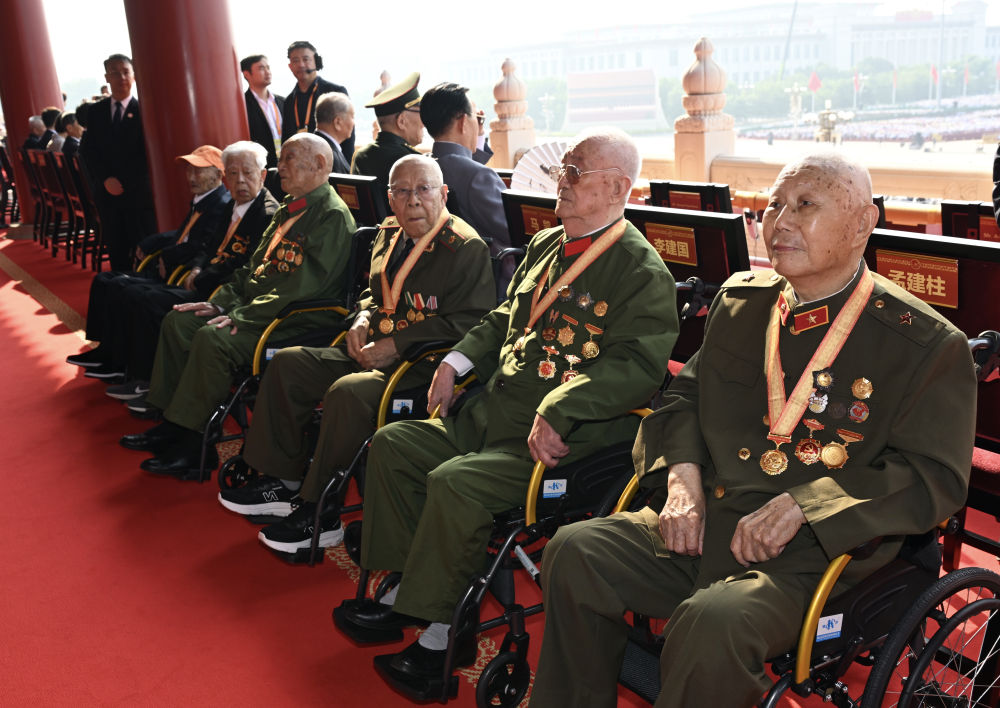 抗戰(zhàn)老戰(zhàn)士老同志代表在天安門城樓。新華社記者 謝環(huán)馳 攝
