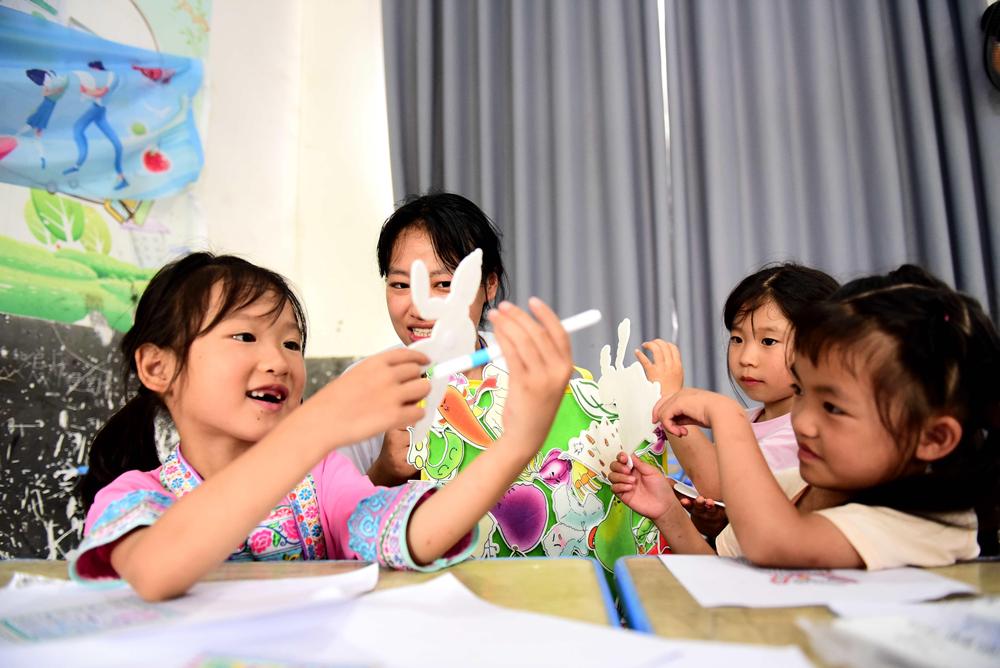 2025年7月16日,貴州黔東南州從江縣,江南大學(xué)支教老師在獨洞小學(xué)指導(dǎo)學(xué)生制作繪本彩繪。