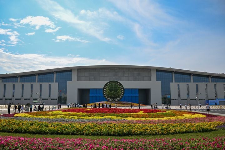 這是2025年9月1日拍攝的天津梅江會展中心外的花壇。