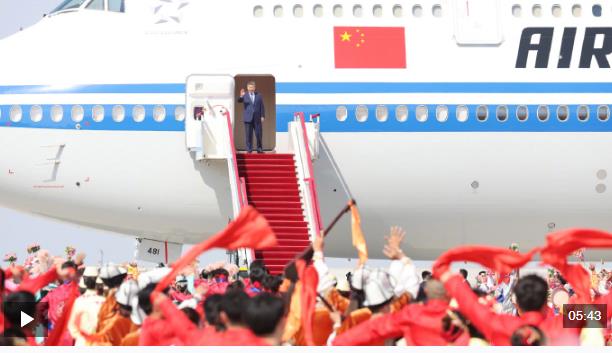 在機場,各族群眾代表身著民族服飾,載歌載舞。從機場到住地,各族群眾手持紅旗,熱情歡呼,表達(dá)對總書記的歡迎和感激之情。