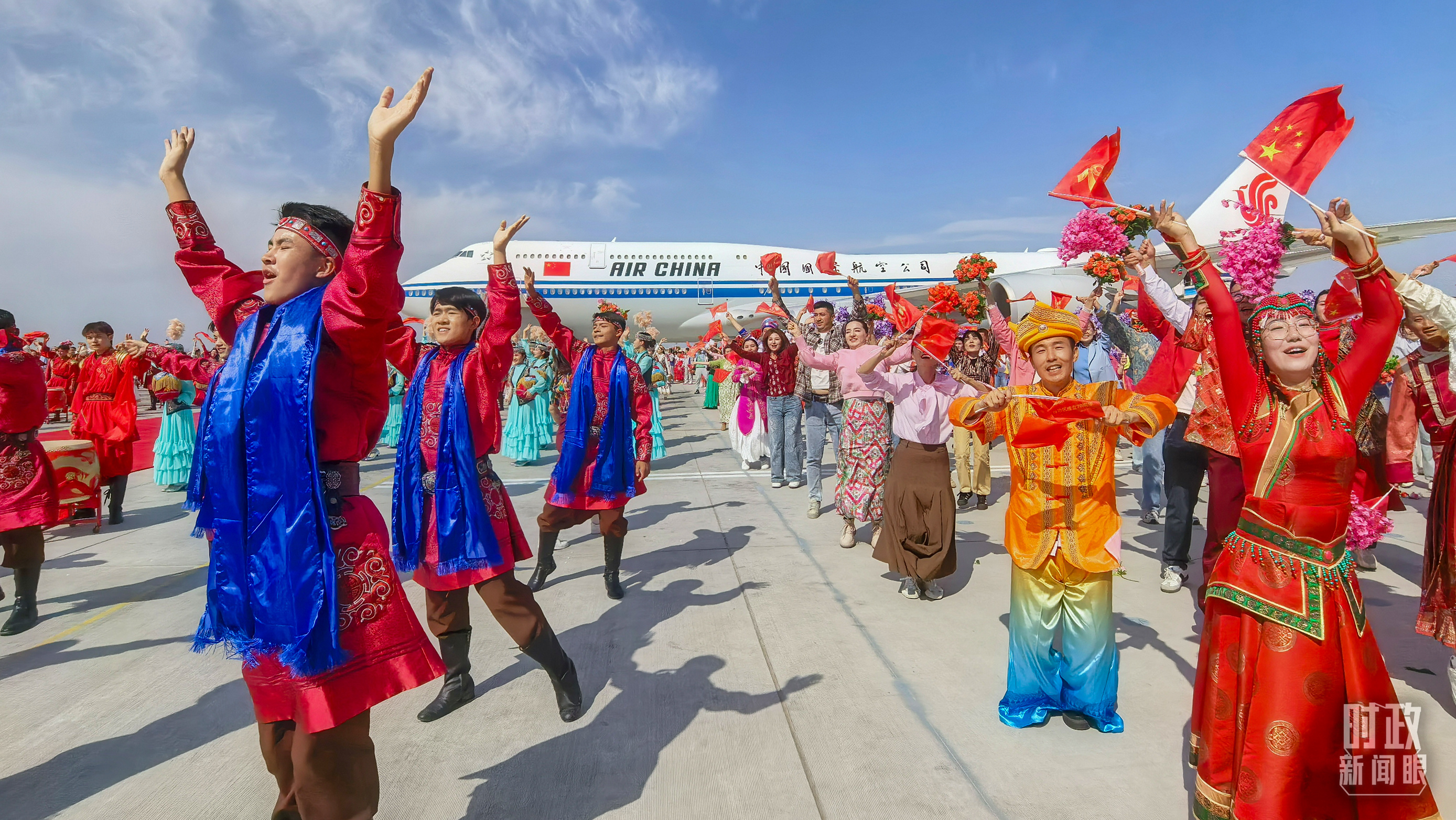 烏魯木齊天山國際機場,新疆各族群眾熱烈歡迎總書記到來。(總臺央視記者范凱、史偉拍攝)