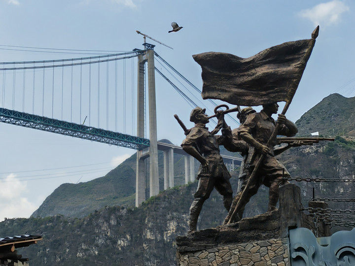 這是2025年4月28日拍攝的貴州花江峽谷大橋。9月28日,新的世界第一高橋——貴州花江峽谷大橋建成通車。近處的則是一座建于1898年、由14根鐵鏈組成的花江鐵索橋。1935年4月,中央紅軍右路縱隊挺進(jìn)黔西南,死守花江鐵索橋這一戰(zhàn)略要沖,確保紅軍主力順利搶渡北盤江。新舊兩座橋,橫跨著百年歷史風(fēng)云,見證著血與火的艱辛歷程。