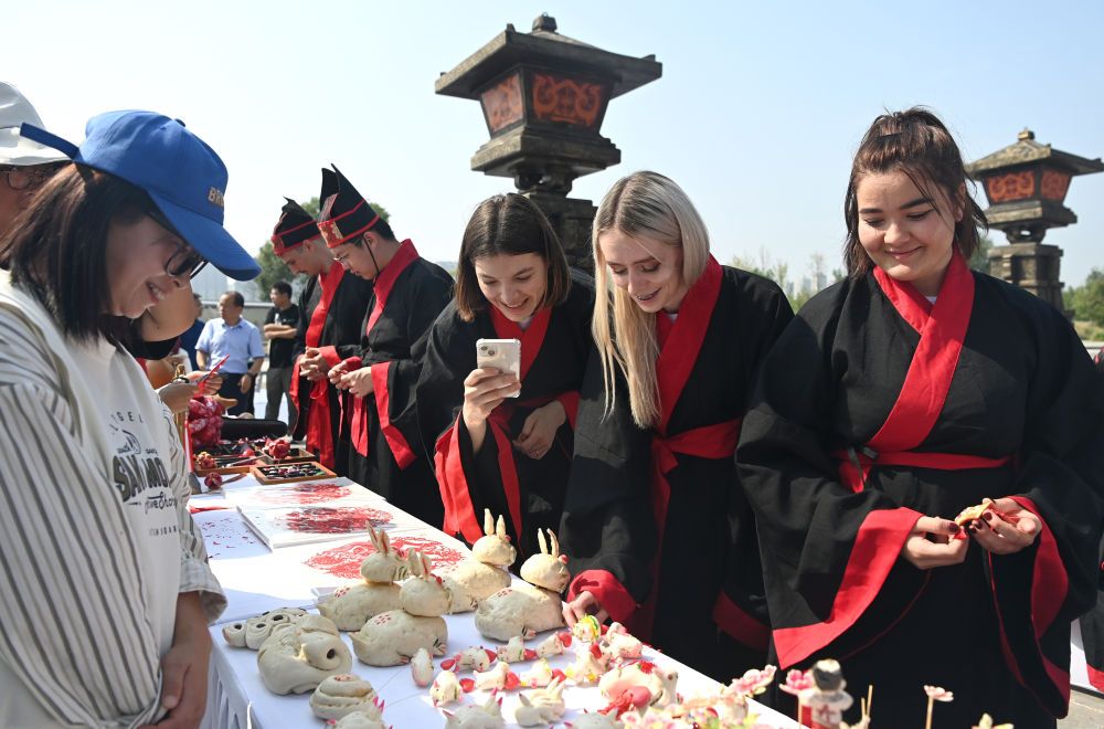 2023年9月16日,“絲路起點(diǎn) 文明根脈”2023西安絲路留學(xué)生交流活動(dòng)在西安啟動(dòng),來自西安交通大學(xué)的百名中外大學(xué)生著漢服、行漢禮,通過沉浸式體驗(yàn),了解中國(guó)傳統(tǒng)文化。這是中外大學(xué)生在交流活動(dòng)上了解陜西非遺。
