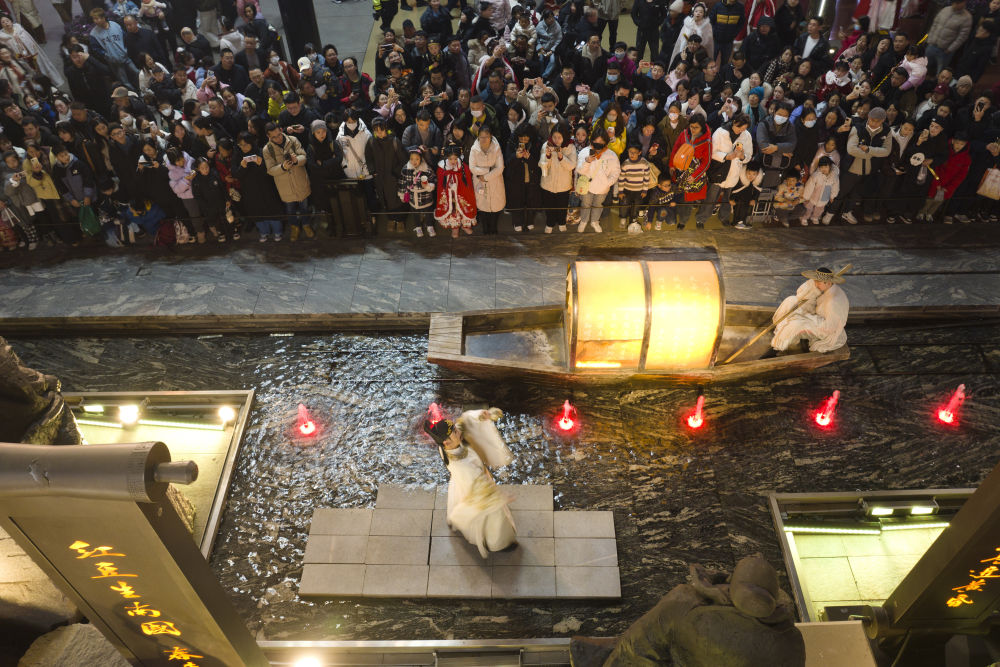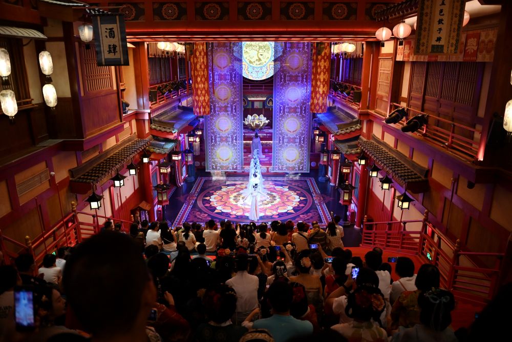 2024年5月12日,游客在西安長(zhǎng)安十二時(shí)辰主題街區(qū)內(nèi)觀看演出。街區(qū)通過漢服旅拍、演藝互動(dòng)、非遺體驗(yàn)等項(xiàng)目,讓游客“穿越”回盛唐長(zhǎng)安,為游客打造科技感、文化味十足的游歷體驗(yàn)。