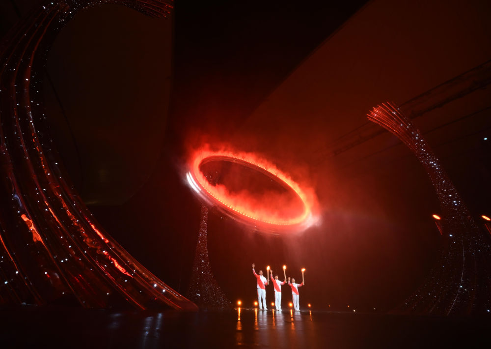 2025年11月9日,第十五屆全國運(yùn)動會開幕式在廣東奧林匹克體育中心舉行。這是火炬手蘇炳添(中)、張家朗(左)、李祎點(diǎn)燃主火炬后向觀眾致意。新華社記者 肖藝九 攝