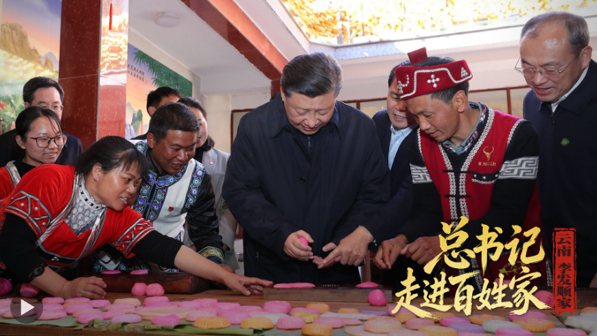 2020年春節(jié)前夕,習(xí)近平總書記走進(jìn)云南騰沖市清水鄉(xiāng)三家村中寨司莫拉佤族村,同村民李發(fā)順一家制作當(dāng)?shù)毓?jié)日傳統(tǒng)食品大米粑粑??倳浺贿B做了兩個,笑著說:“摁了個福字,再來一個喜字,有福有喜。”