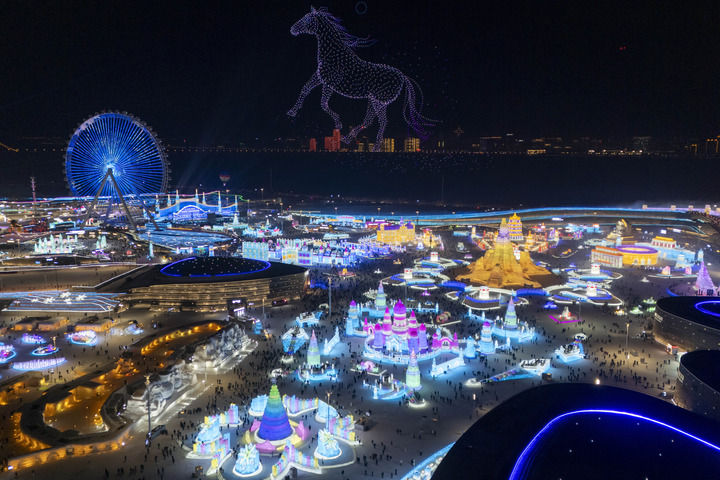 這是2026年1月5日拍攝的哈爾濱冰雪大世界園區(qū)的無(wú)人機(jī)表演(無(wú)人機(jī)照片)。