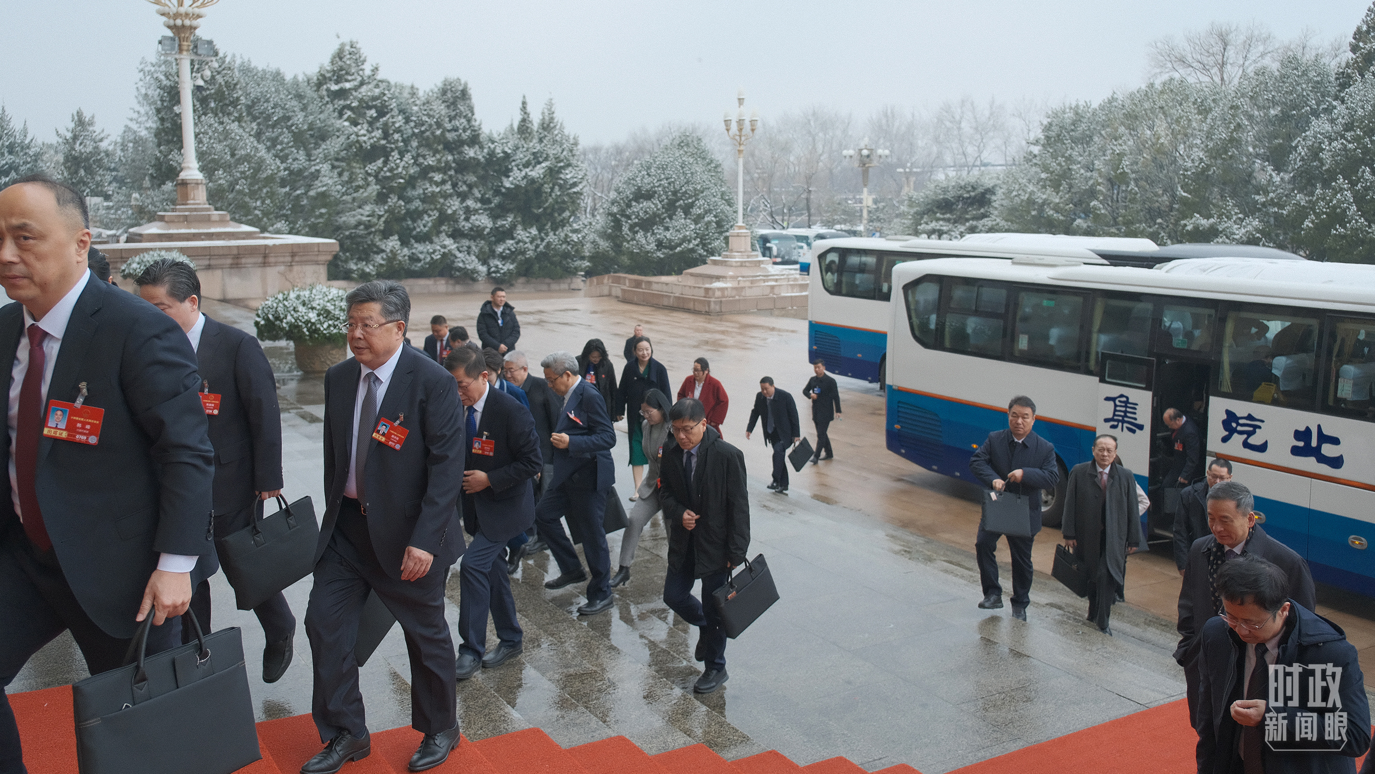 江蘇代表團(tuán)乘車(chē)前往人民大會(huì)堂。(總臺(tái)記者黃成拍攝)