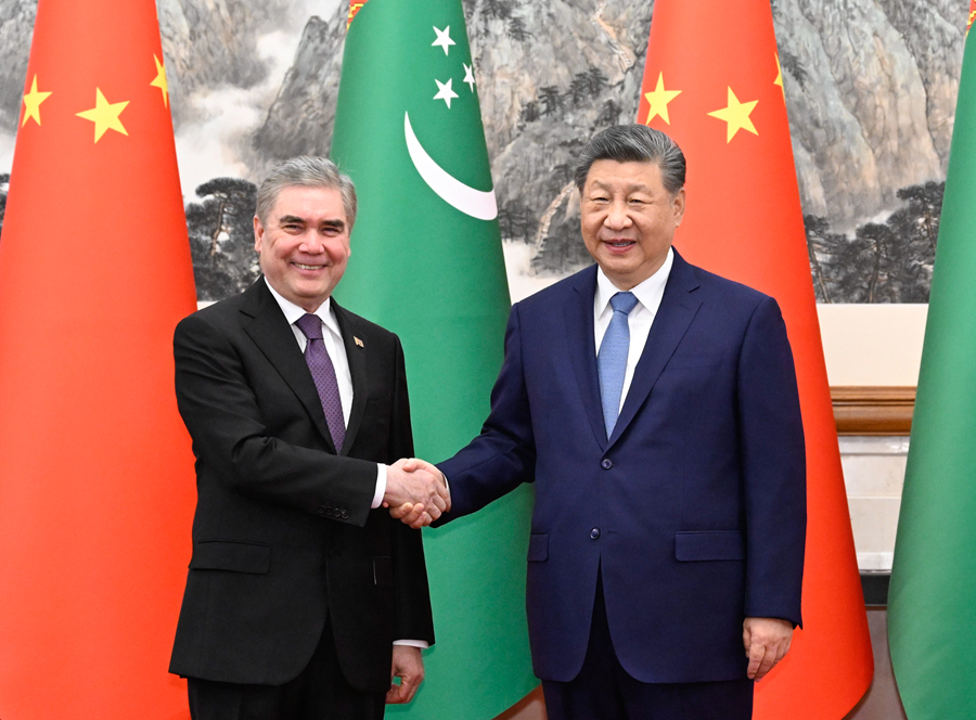 3月18日下午,國(guó)家主席習(xí)近平在北京釣魚(yú)臺(tái)國(guó)賓館會(huì)見(jiàn)來(lái)華進(jìn)行友好訪問(wèn)的土庫(kù)曼斯坦民族領(lǐng)袖、人民委員會(huì)主席別爾德穆哈梅多夫。新華社記者 申宏 攝