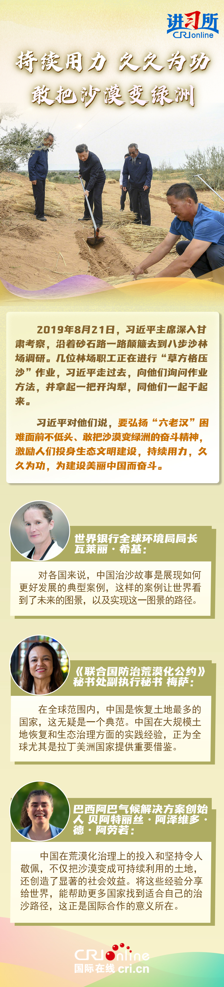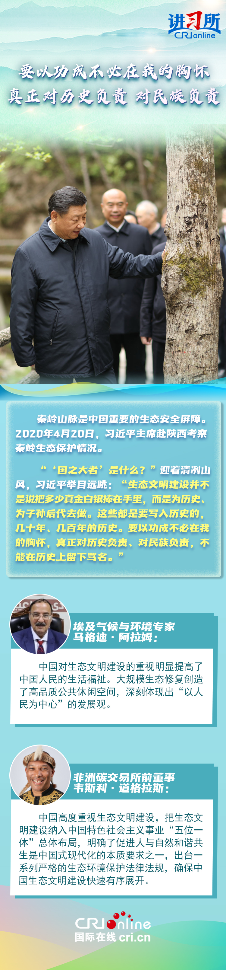 中共十八大以來,中國森林面積和蓄積量持續(xù)“雙增長”,荒漠化和沙化土地面積持續(xù)“雙縮減”,是全球增綠最多最快的國家。習近平主席始終身體力行:在北京連續(xù)14年參加首都義務植樹活動,在甘肅與林場職工一起進行“草方格壓沙”作業(yè),在陜西親自“驗收”秦嶺生態(tài)保護……