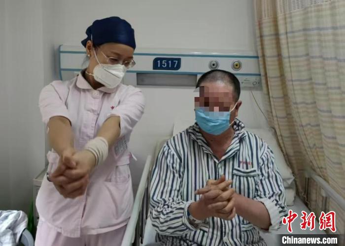 護士陸妍紅指導患者進行上肢運動。(傅怡攝)