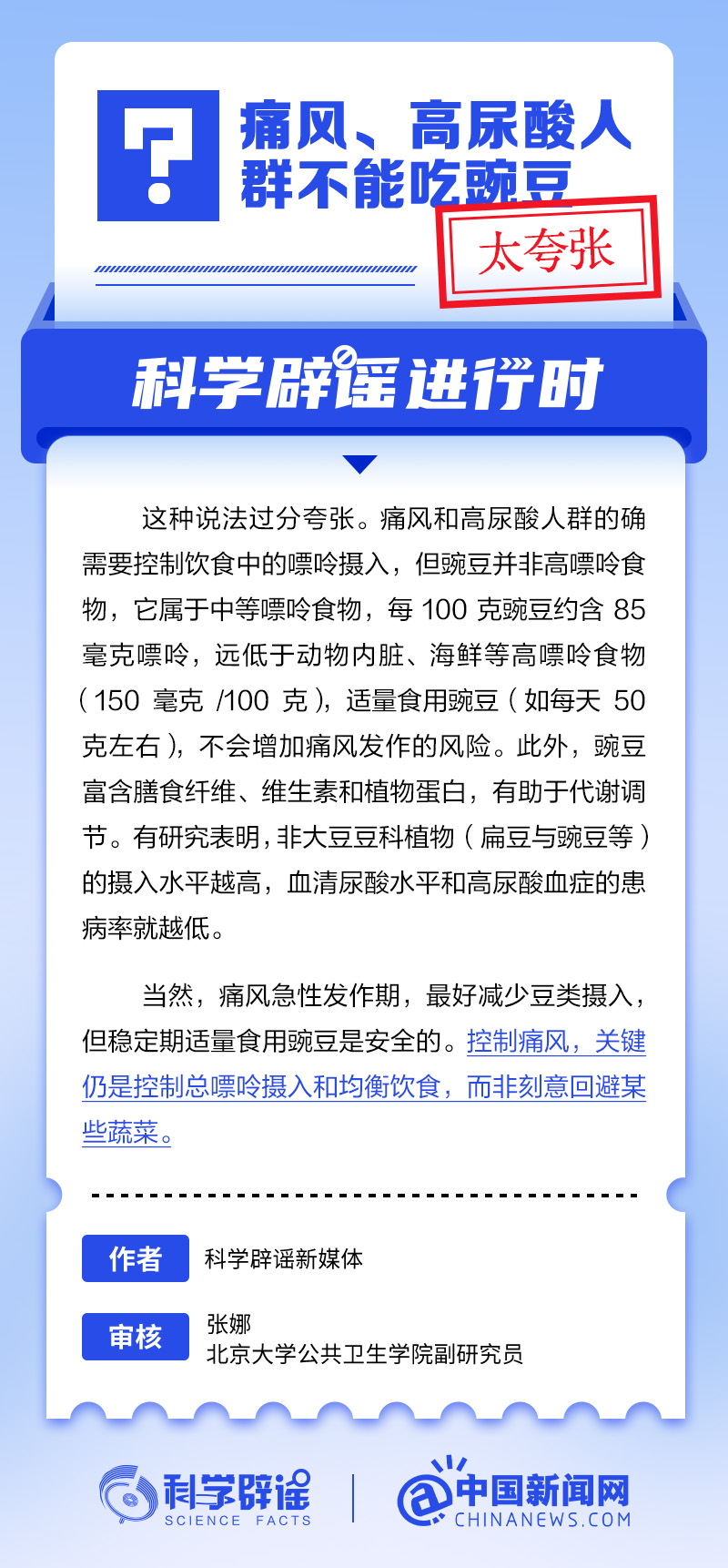 痛風和高尿酸人群的確需要控制飲食中的嘌呤攝入,但豌豆并非高嘌呤食物,它屬于中等嘌呤食物,每100克豌豆約含85毫克嘌呤,遠低于動物內臟、海鮮等高嘌呤食物(150毫克/100克),適量食用豌豆(如每天50克左右),不會增加痛風發(fā)作的風險。此外,豌豆富含膳食纖維、維生素和植物蛋白,有助于代謝調節(jié)。(來源:@科學辟謠 中國新聞網微博)