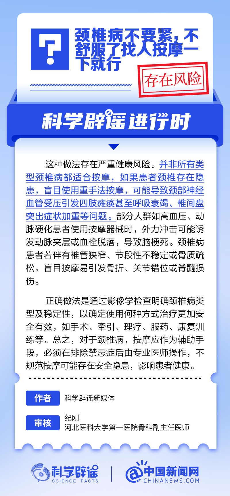 并非所有類型頸椎病都適合按摩,如果患者頸椎存在隱患,盲目使用重手法按摩,可能導(dǎo)致頸部神經(jīng)血管受壓引發(fā)四肢癱瘓甚至呼吸衰竭,椎間盤突出癥狀加重等問題。部分人群如高血壓、動(dòng)脈硬化患者使用按摩器械時(shí),外力沖擊可能誘發(fā)動(dòng)脈夾層或血栓脫落,導(dǎo)致腦梗死。頸椎病患者若伴有椎管狹窄、節(jié)段性不穩(wěn)定或骨質(zhì)疏松,盲目按摩易引發(fā)骨折、關(guān)節(jié)錯(cuò)位或脊髓損傷。(來源:@科學(xué)辟謠 中國新聞網(wǎng)微博)