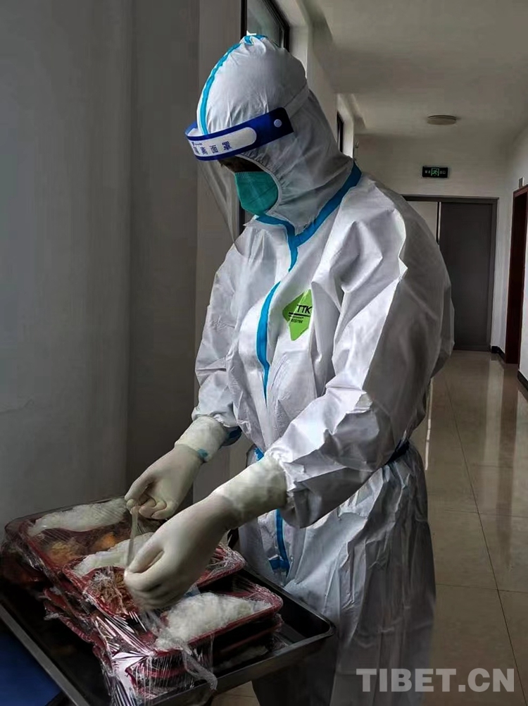圖為瓊結(jié)縣藏醫(yī)院醫(yī)護(hù)人員在瓊結(jié)縣產(chǎn)業(yè)園隔離點(diǎn)給隔離人員送飯