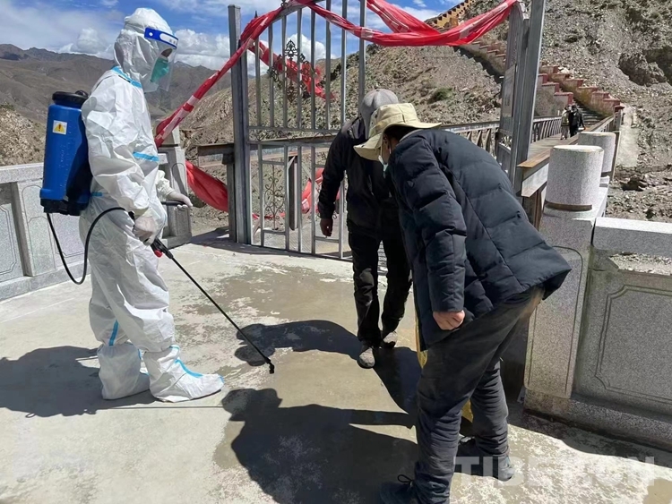 圖為瓊結(jié)縣藏醫(yī)院醫(yī)護(hù)人員在瓊結(jié)縣下水鄉(xiāng)唐布齊村做消殺工作