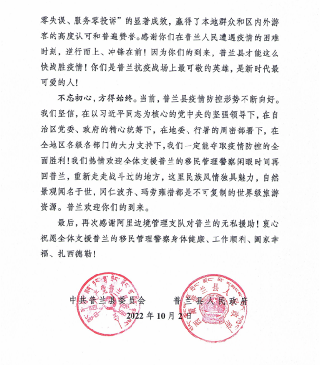 中國(guó)西藏網(wǎng)訊 “普蘭縣發(fā)生新冠肺炎疫情后,阿里邊境管理支隊(duì)第一時(shí)間選派精干力量支援普蘭疫情防控工作,為打贏疫情防控阻擊戰(zhàn)、攻堅(jiān)戰(zhàn)發(fā)揮了至關(guān)重要的作用?!?0月2日,西藏自治區(qū)阿里邊境管理支隊(duì)收到一封來自阿里地區(qū)普蘭縣委的感謝信。信中對(duì)阿里邊境管理支隊(duì)?wèi)?zhàn)“疫”一線民警在一個(gè)多月的疫情防控工作中,克服困難、勇于擔(dān)當(dāng)、不分晝夜、持續(xù)奮戰(zhàn)的抗疫工作表達(dá)了感謝,給予了肯定。