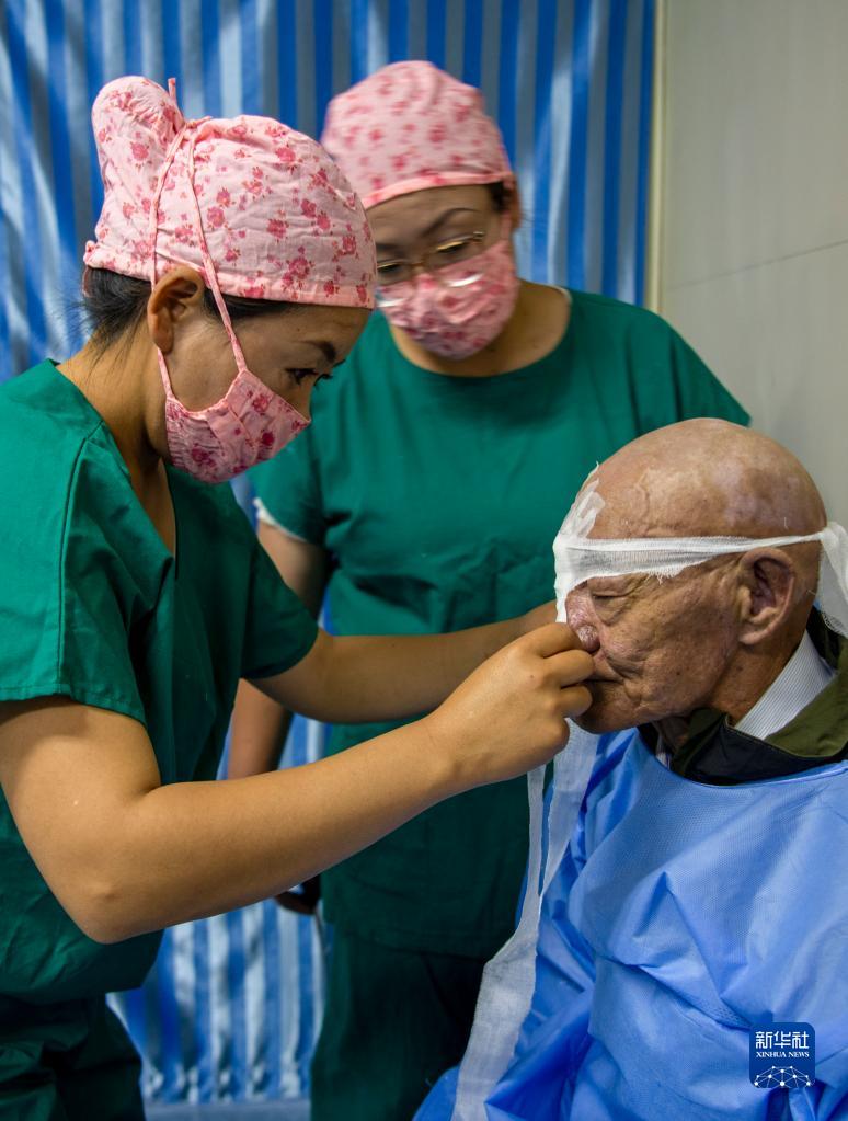 6月8日,光明眼科康復(fù)診療院的護士在為一位農(nóng)牧民白內(nèi)障患者做術(shù)后包扎。新華社記者 姜帆 攝
