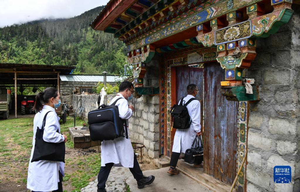 6月12日上午10點(diǎn),廣東珠海市人民醫(yī)院第七批援藏醫(yī)療隊(duì)隊(duì)長(zhǎng)王振疆、隊(duì)員陳冰、王彤旭和年輕的當(dāng)?shù)蒯t(yī)生尼瑪益西一起帶著醫(yī)療設(shè)備和藥品,離開西藏米林市人民醫(yī)院,驅(qū)車前往30多公里外的吞不絨村為患者進(jìn)行診療。