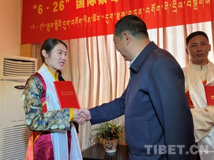 圖為相關(guān)領(lǐng)導(dǎo)為西藏禁毒達(dá)人頒發(fā)榮譽(yù)證書 攝影:德吉卓瑪