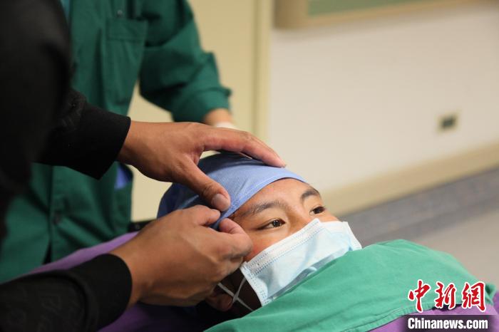 11月21日上午,扎著兩只麻花辮的澤巴永宗即將在北京大學(xué)第一醫(yī)院接受脊柱側(cè)凸矯形手術(shù),要進手術(shù)室時,哥哥貢布鄧珠幫她將額角的頭發(fā)掖進手術(shù)帽中。中新網(wǎng)記者 朱賀 攝