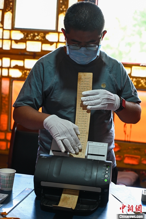 圖為6月27日,拉薩,西藏自治區(qū)藏醫(yī)院文獻(xiàn)研究所工作人員掃描古籍。 中新社記者 趙朗 攝