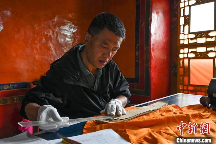 圖為6月27日,拉薩,西藏自治區(qū)藏醫(yī)院文獻(xiàn)研究所相關(guān)負(fù)責(zé)人次旦平措對交接而來的古籍檢查測量尺寸。 中新社記者 趙朗 攝