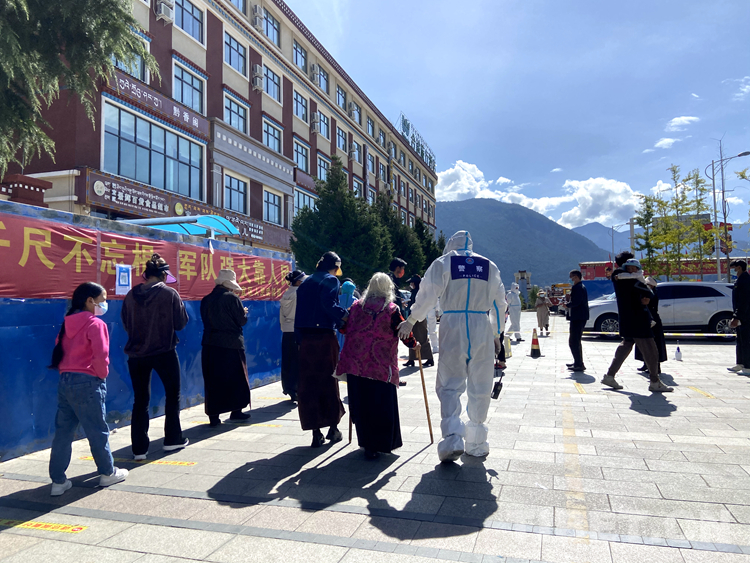 林芝邊境管理支隊(duì)輪訓(xùn)隊(duì)民警孫震正攙扶行動不便的老人前往核酸檢測點(diǎn) 攝影:任遠(yuǎn)波