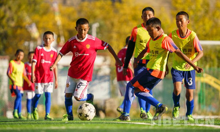 圖為2021年全國青少年體育冬夏令營進(jìn)校園活動(dòng)(西藏站)閉營儀式上,學(xué)生們正在進(jìn)行足球比賽 攝影:趙耀