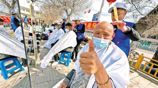 在拉薩市開(kāi)展的“ 民族團(tuán)結(jié)一家 巧手剪出民族情”愛(ài)心義剪志愿服務(wù)活動(dòng)中,理發(fā)師們?yōu)楦髯迦罕娎戆l(fā)。記者 格桑倫珠 唐斌 攝