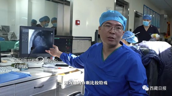 在實(shí)施手術(shù)時(shí),閆朝武教授在手術(shù)室里運(yùn)籌帷幄,一邊指導(dǎo)西藏同事進(jìn)行手術(shù)操作,一邊緊盯顯示屏密切關(guān)注患者的生命體征變化,經(jīng)過50分鐘的緊張手術(shù),全區(qū)第一例肺動(dòng)脈瓣狹窄介入治療順利完成!