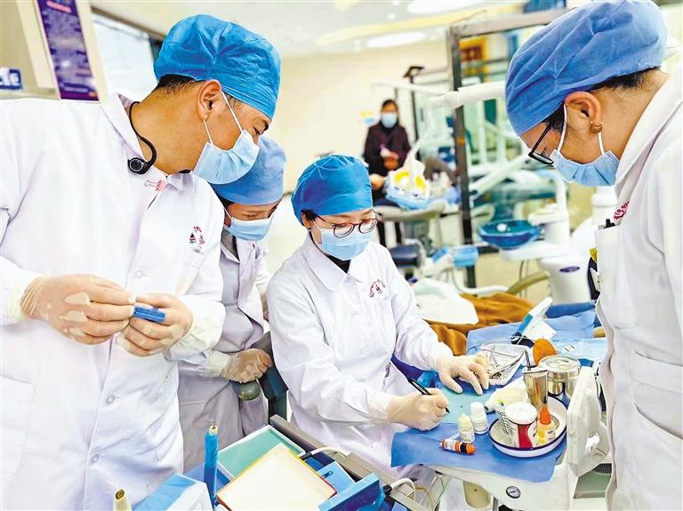 湖南援藏醫(yī)生、山南市藏醫(yī)醫(yī)院口腔科副主任醫(yī)師徐麗(中)圍繞橡皮障隔離術(shù)進(jìn)行實(shí)操帶教。記者 劉楓 攝