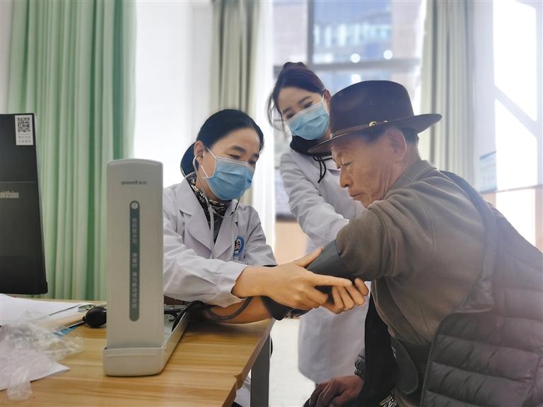 圖為乃東區(qū)結(jié)莎街道瑪嘎慶社區(qū)診所醫(yī)生為老人測(cè)量血壓。 記者 孫開遠(yuǎn) 攝